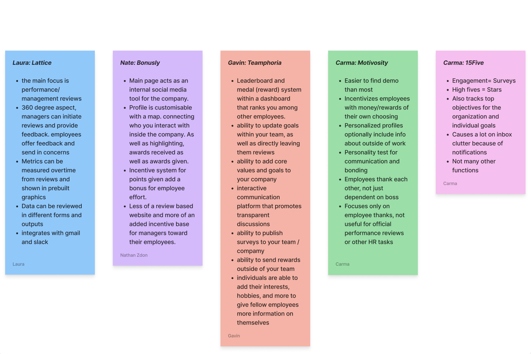 As a team, we researched other similar programs that currently had a performance review feature. Most competitors didn’t have a website available to the average user, so we had to get creative to understand what made the competitors stand out. I looked to Youtube and G2 to find video and written reviews