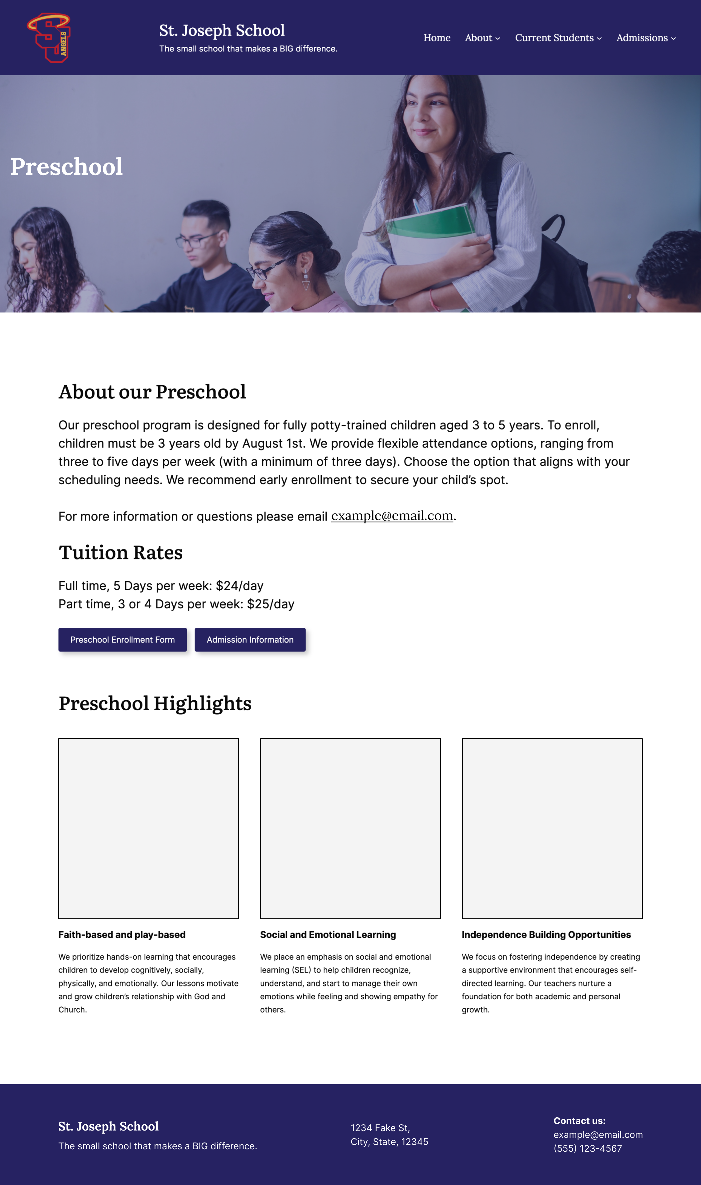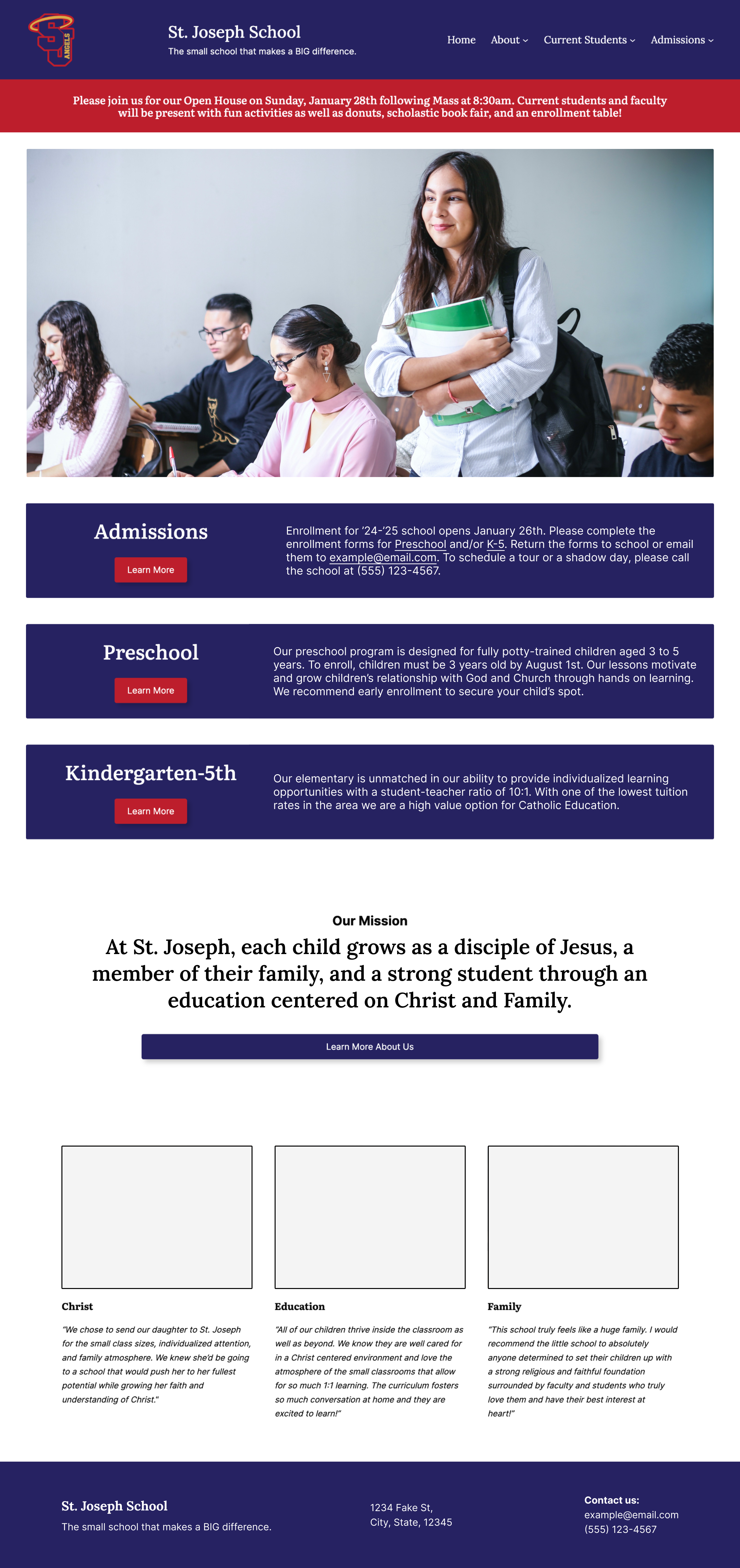 Homepage: Highlighting the school’s mission and promoting enrollment for the upcoming school year.