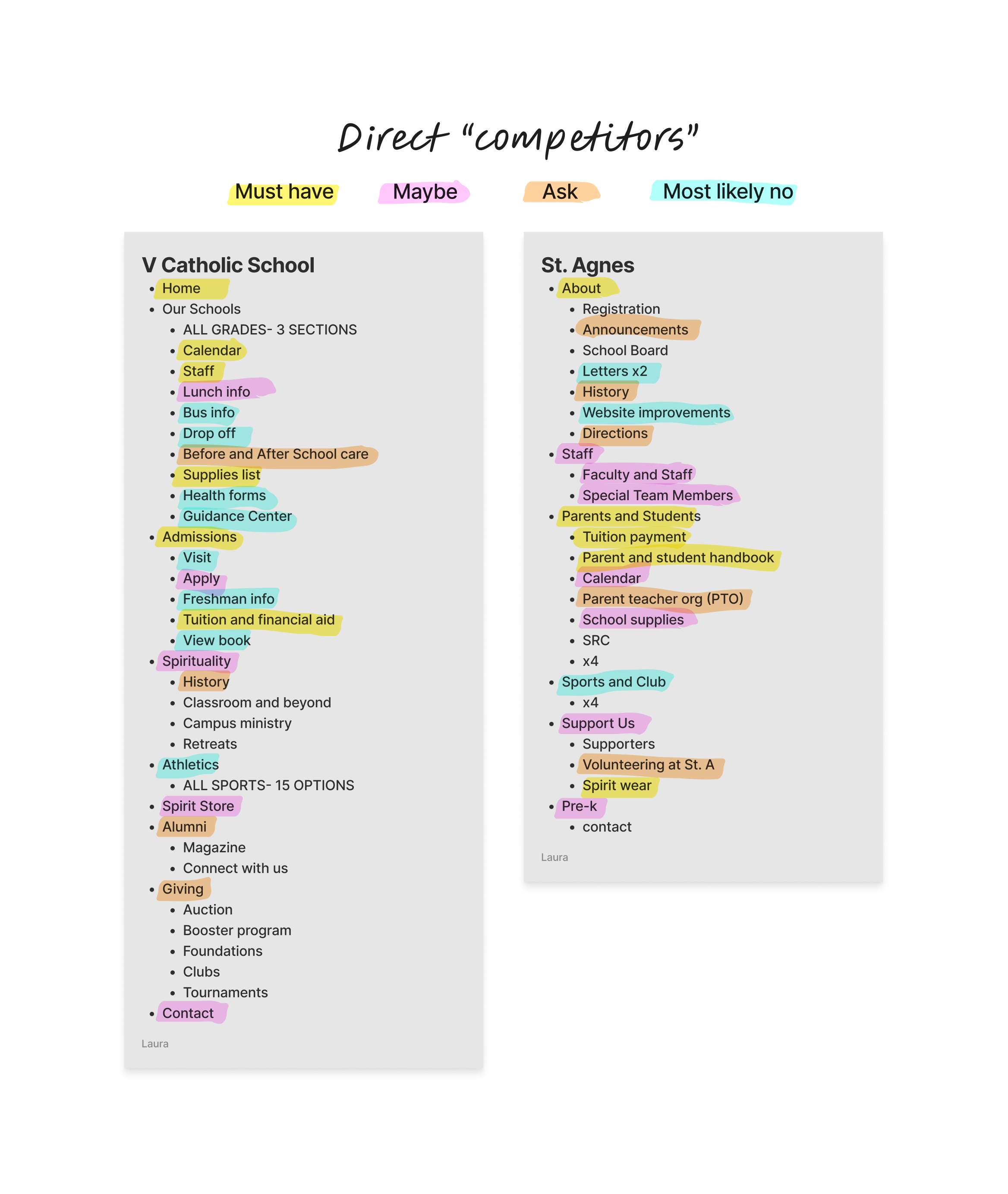 I combed through two direct "competitor school’s” websites to put their pages into categories.
